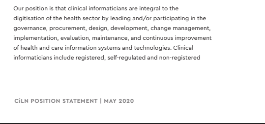 Point 3: "Recognition that clinical informaticians are fundamental to the success of data and digital initiatives. This includes leading and informing policies, strategies, engagements, partnerships, stewardship and governance, as well as active participation and representation in design, implementations, delivery, and evaluations of data-driven and digital health technologies.