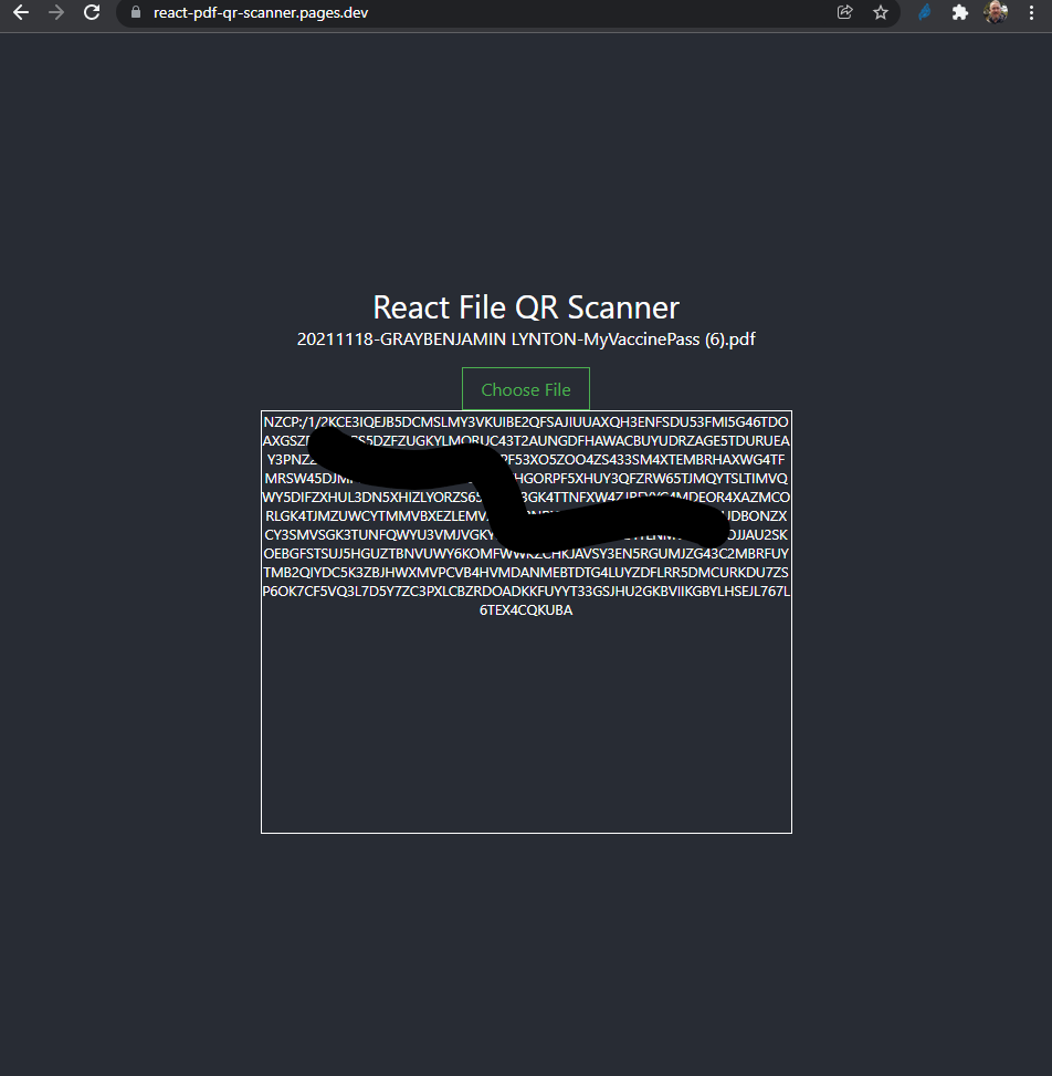 We could not find a suitable React library to read PDF, PNG, JPEG - so we packaged our work up on NPM here. The idea of supporting images is that a user can take a screenshot or photo of a QR code on a certificate they have been issued, and upload that - all using a mobile phone if desired.