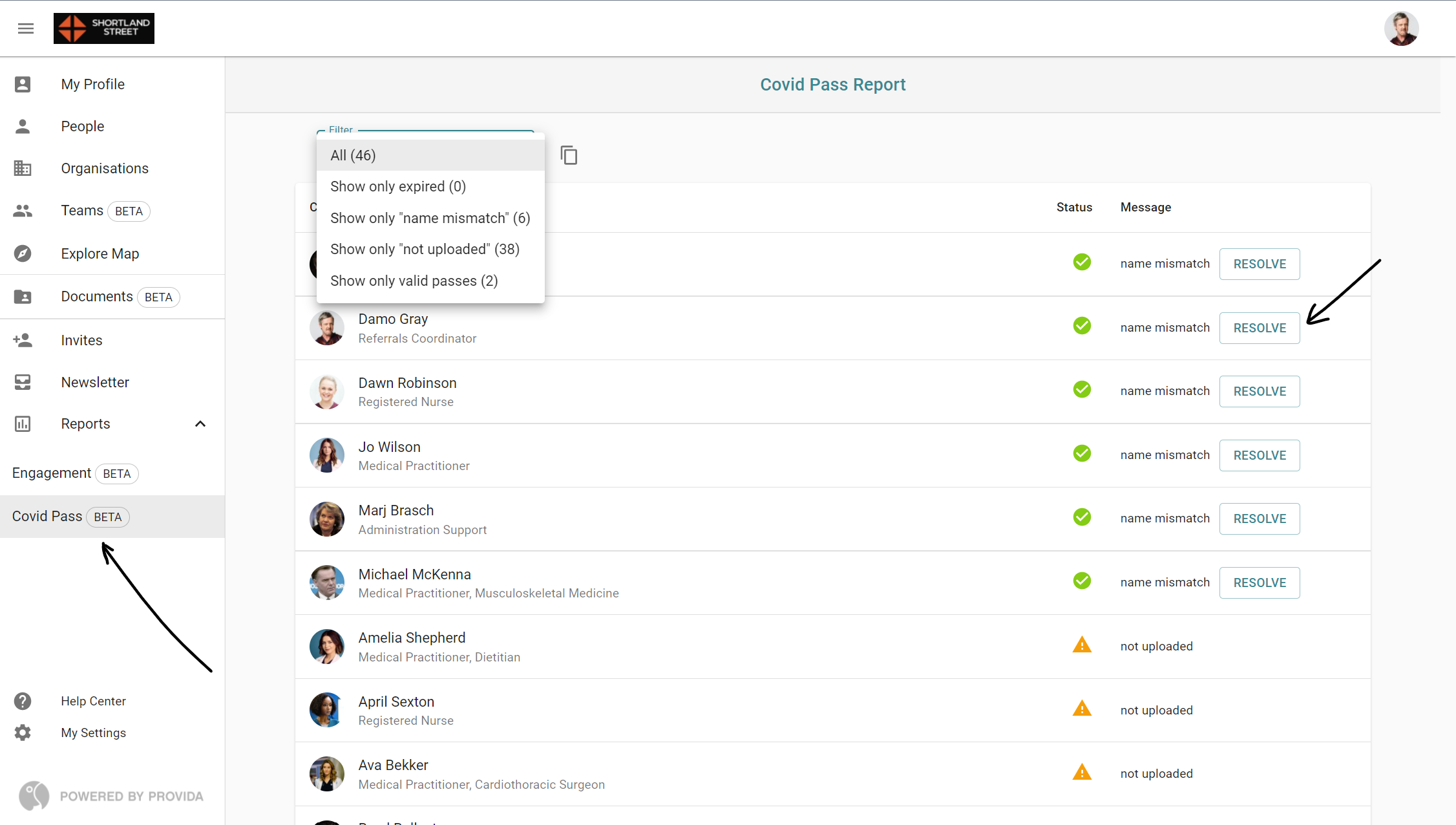 This is our Shortland St demo site. Perfect name matches are automatically approved. Any names that do not match require a resolution step like this:
