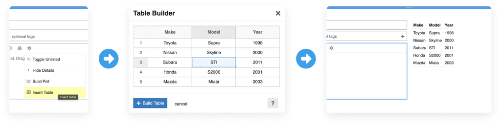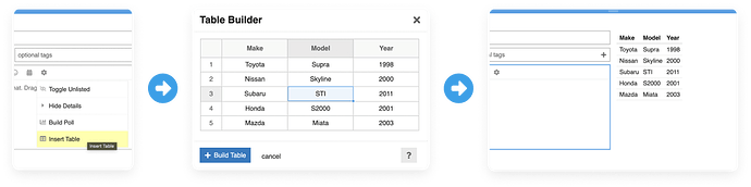 In addition to using markdown to manipulate / add tables as @alastairk describes, we’ve also got extended functionality in the UI here in the eHealth Forum using the Table Builder: