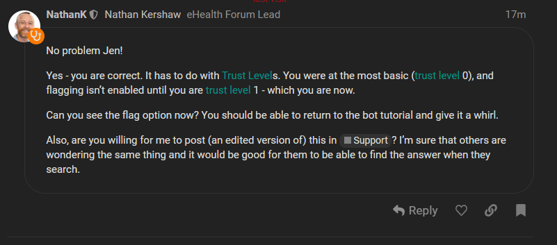Sorry to ask you about something that should be really basic. I’m new to the eHealth Forum and working through the bot tutorial. I have come to a blockage with flagging a post. I can not find any useful guidance on this.