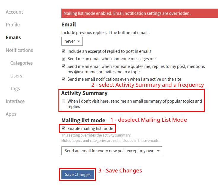 In response to some feedback we’ve received about the volume of notifications on the Networks, I thought I’d do a quick guide to using the detailed features in Discourse to set your preferences for email notifications.